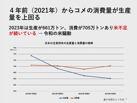 相場の関係もありますが、そもそも日本の米政策そのものが間違っていると思います。多くの国民は米を作りすぎているという印象を持っていますが、実際にはもう5年前から生産量よりも消費量の方が多いのです。