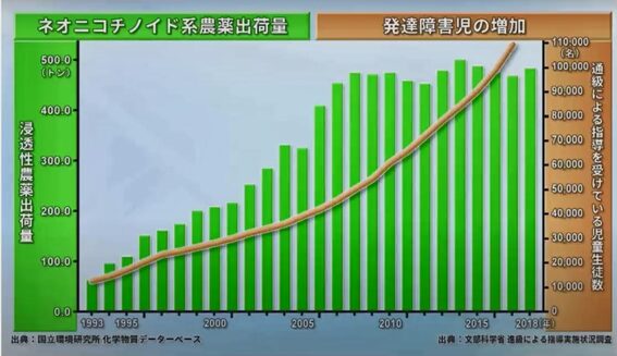 何が原因なのか、これをしっかり考えないといけないのですが、20年前から農薬ネオニコチノイドの散布量と発達障害の増加度合いが一致しているのです。