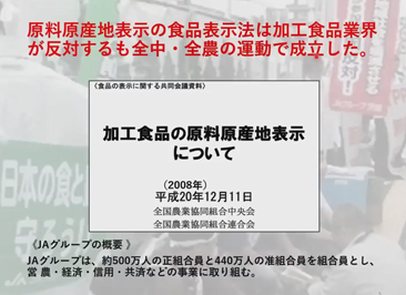 僕が一人で作ったわけではないのですが、大臣になる前に民主党政権の時に作った法律です。当時JAグループが、これを『加工品の原料原産地表示について』というタイトルでこういう運動を展開したのです。