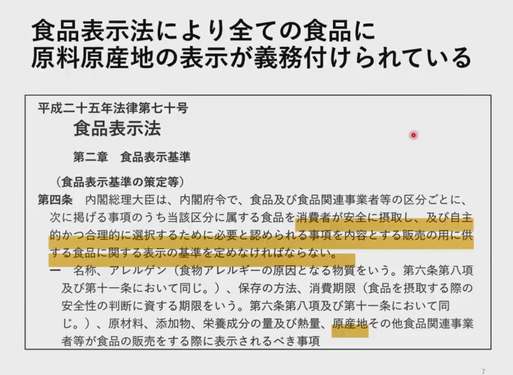 そうです。かつて、20年前になるのですが『食品表示法』という法律で、僕が農水大臣になる前に作られました。その法律では原産地表示が義務付けられているのです。