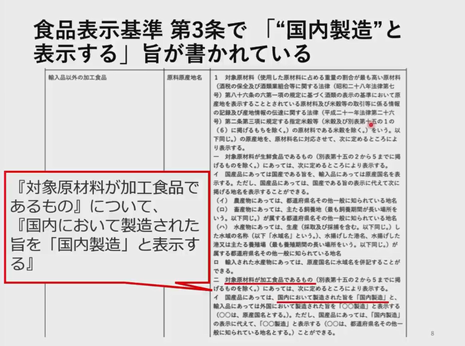 このように食品表示基準第3条で『国内』でいいと言いつつ「何か一粒でも異なるものが入っているものを『国産』と書いたら厳重に罰する」と脅迫しているわけですよね。これでは中小企業が震え上がってしまいますよね。