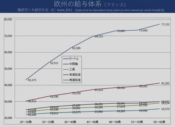 次に、このグラフを見てください。これはフランスの給与体系ですよ。カードルというのはエリート層で、大学を出ただけではなれないのです。グランゼコールという大学よりもさらに一段上で、選ばれた人しか入れないのですが、出てきた瞬間にもう700万円ぐらいから始まって、1000万、1200万が平均なのですよ。しかも男女込みで、育休を取っている人も入れてこの給与になるのです。