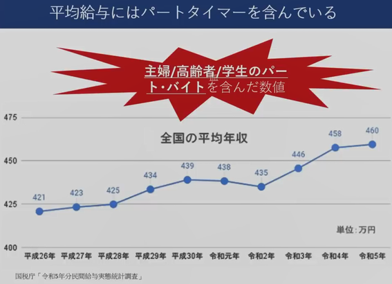 今、中央値を出しましたよね。中央値ではなく平均値の方はもう少し上なのですが、平均値でも460万円という数字をよく出すのですよ。しかし、これもパートタイマーが入っているのです。