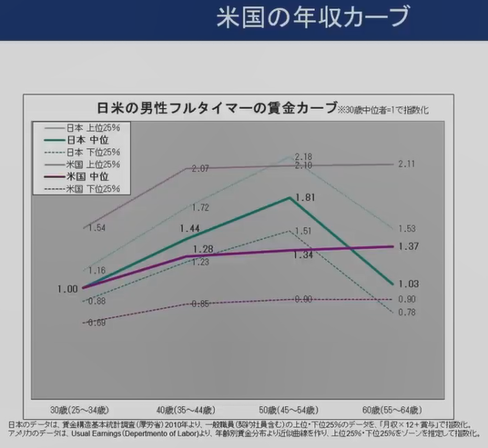 アメリカの中位の人を見ると、30歳から40歳までは3割ぐらいは給与伸びるのですが、40歳以降は給与が上がらないのですよ。アメリカは、普通の人は上がらないのです。上がるのはエリートだけですよ。