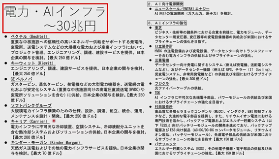 原子炉もそうなのですけれど、SMRという小型モジュール炉で、新型の原子力発電所ということです。ここにWestinghouse やGEとかアメリカの企業の名前があり、三菱重工など日本の重電の名前も並んでいて、一緒にやると凄い金額で「最大で30兆円?!本当か?」という話です。それから電力・AⅠインフラに、たくさん名前が書いてあります。