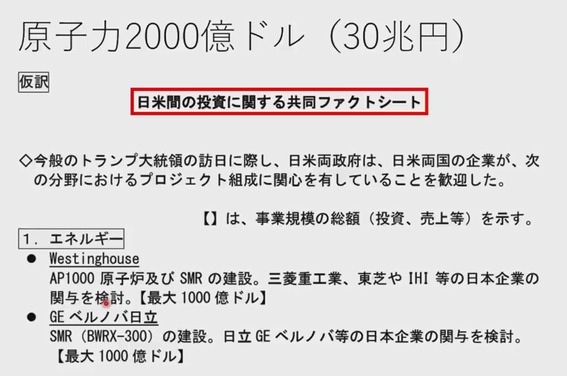 それで「関税投資に関して合意した」と言っていましたが、合意した割には中身が今ひとつよく分からなかったのだけれども、このファクトシートで、その中身らしきものが出てきました。中身らしきものは、完全に紐づいているのかというとそうでもなくて、ここに書いてありますけれど「今般のトランプ大統領の訪日に際し、日米両政府は、日本両国の企業が、次の分野におけるプロジェクト組成に関心を有していることを歓迎した」ということです。