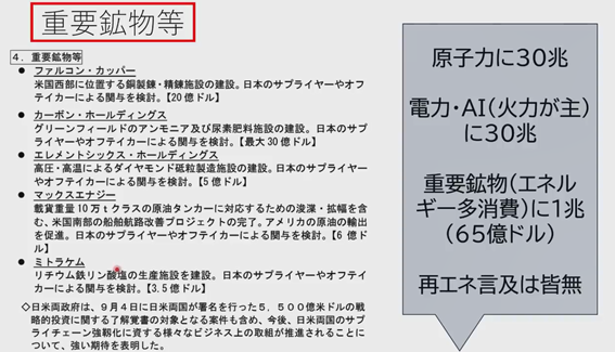 もうひとつ、このファクトシートに「重要鉱物等」と書いています。銅の精錬やアンモニアなどの肥料製造です。こちらにも日米の企業の名前が書いてあって、金額では全部足しても65億ドルなので、日本円にすると1兆円です。さっきの30兆円に比べると小さく感じるけれど、1兆円は大きな金額です。