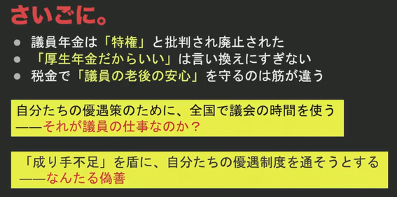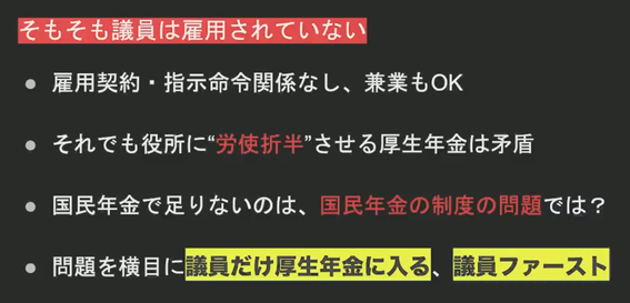 さらに、さっき萌絵さんがおっしゃったように、国民年金は確かに給付が少ない。これは国民年金制度の問題であって、他にも自営業やフリーランスの方などが、やはり給付が少なくて困っています。それがなぜ、議員だけが厚生年金に入れる仕組みを作って、自ら救われようとするのですか?これぞ『議員ファースト』ではないかと、私はおかしいと思って反対なのですよ。