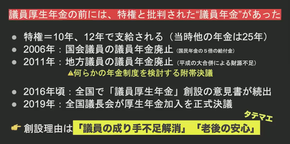 そういうことですよ。まず議員年金があった頃からの資料を見ていただければと思うのですけれど、元々、議員年金というのが大昔に存在しました。これは議員しか入れない議員のための専用の年金で、特権という批判も多かったので、もう無くなりました。