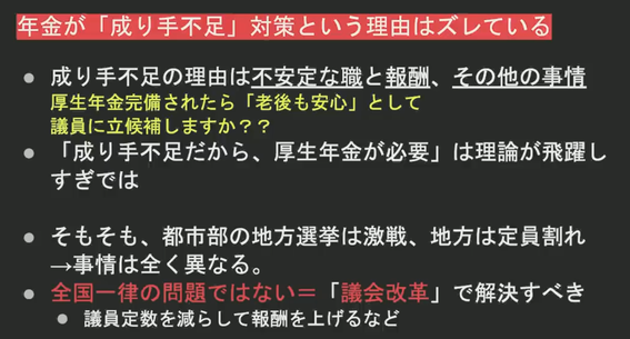 それがあってか、たった5年後の2016年頃には全国で、今度は『議員厚生年金』の創設をしましょうという意見書が出るようになるわけです。その3年後の2019年には全国議長会という全国の地方議会を束ねる組織で、正式に「議員の厚生年金加入を進めていきましょう」みたいな決議大会が行われる。これはどういう建付けで、厚生年金が必要かというと「議員の成り手不足解消」なのですよ。