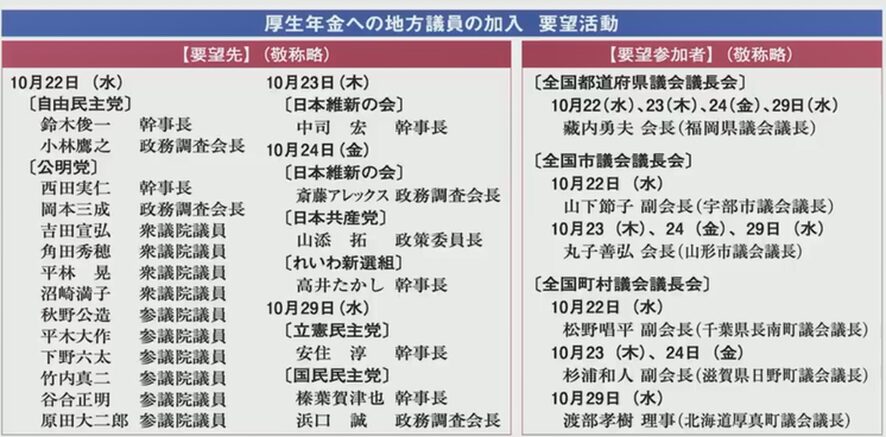 その一方で、最新の市議会旬報には、市議会議長会が、厚生年金のための早急な法改正を国会議員にあちこち回っている要望活動を報じている。これだけの先生方に懇談活動をしてきましたということまで載っているのですよ。