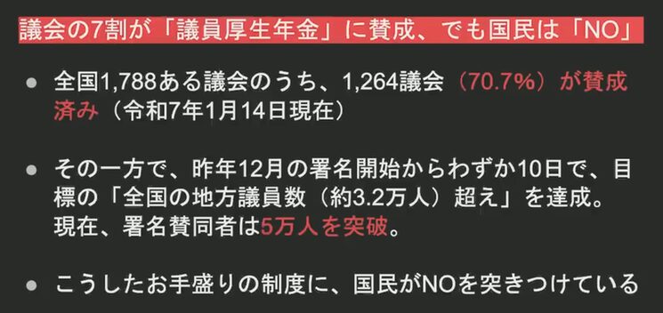 そうですね。議員厚生年金の意見書が全国の地方議会で上がっているとお伝えしましたが、1700以上ある自治体のうち、7割が賛成しているのですよ。7割が敵というか、私と意見が違うということなのですよね。厚生年金が必要だということなのですよね。