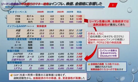 それ以降ずっと増刷を続けまして、FRB(Federal Reserve Board、アメリカの中央銀行)は、2008年には8000億ドルだった通貨を5兆8000億ドルと7.5倍増刷しています。ECB(European Central Bank、ヨーロッパ中央銀行)は2008年が1.4兆ユーロ、現在6兆ユーロで4.3倍増刷しています。ユーロはアメリカよりはちょっと少ないですね。日銀は2008年に100兆円通貨を発行していて、現在7.0倍の695兆円になっています。2025年は2008年に対して、FRBアメリカは7.5倍、ECBは4.3倍、日銀は7.0倍の通貨を増刷したわけです。