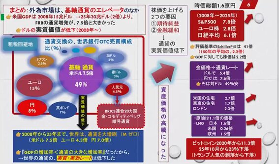 はい、分かりました。怖いですね。このように理論的に見ていくと、円の価値が下がっているだけではなく、ドルの価値がどんどん下がってきているという現象です。日本は外貨準備高のドルをたくさん溜め込んでいますから、日本円とドルは一蓮托生ということですよね。