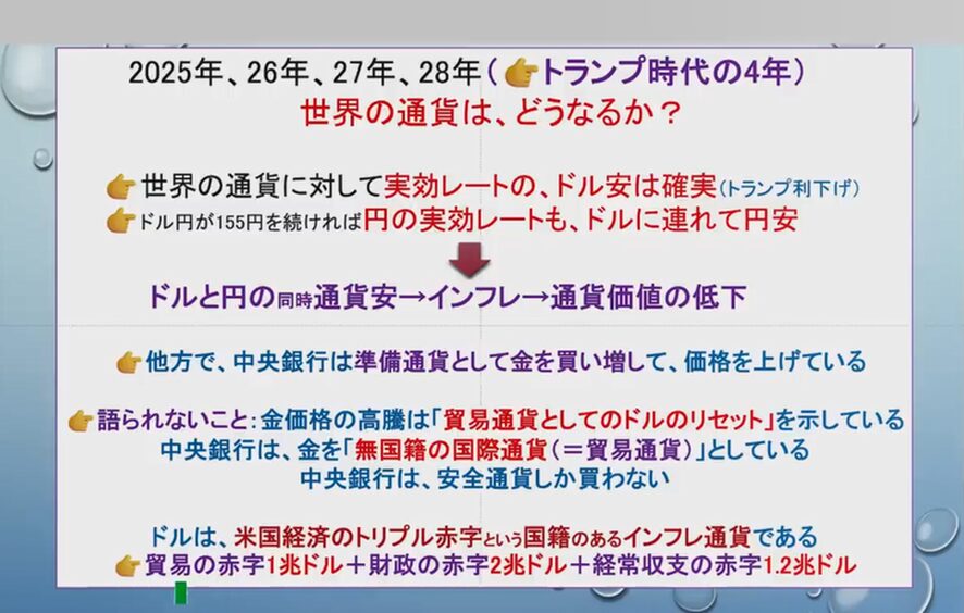 1ドル150円を守ったとしてもトランプ利下げによってドルそのものが下がります。したがって、ドル円と通貨安が起こって、さらにインフレになって、通貨価値の下落が2025年から2028年で想定される。