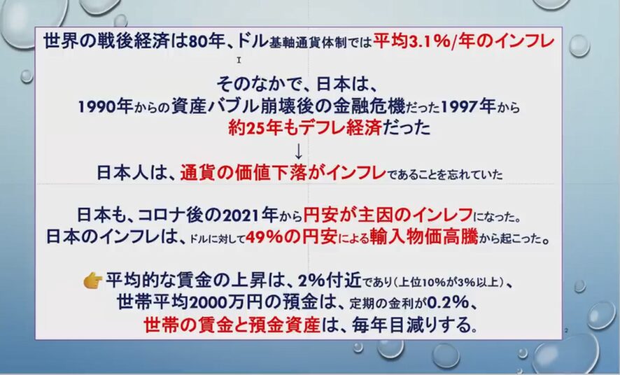 1997年から約25年間、金利ゼロで物価も上がらないデフレ経済だったのですね。25年間、日本人は通貨の価値下落がインフレであることをずっと忘れていたのです。