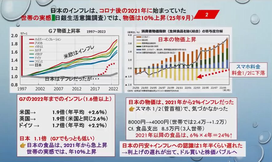 物価上昇に関して、2021年は、菅内閣の時に日本のスマートフォンは世界の2倍高く、世界で4000円から5000円なのに、日本は8000円から1万円もするということでスマホ料金を半分に下げたのですね。菅首相がスマホの料金を2分の1に命令したのです。スマホ料金も消費者物価ですから、これが下がったために、実際の物価は3%ぐらい上がっていたのに、上がっていないように見えていたのですよ。
