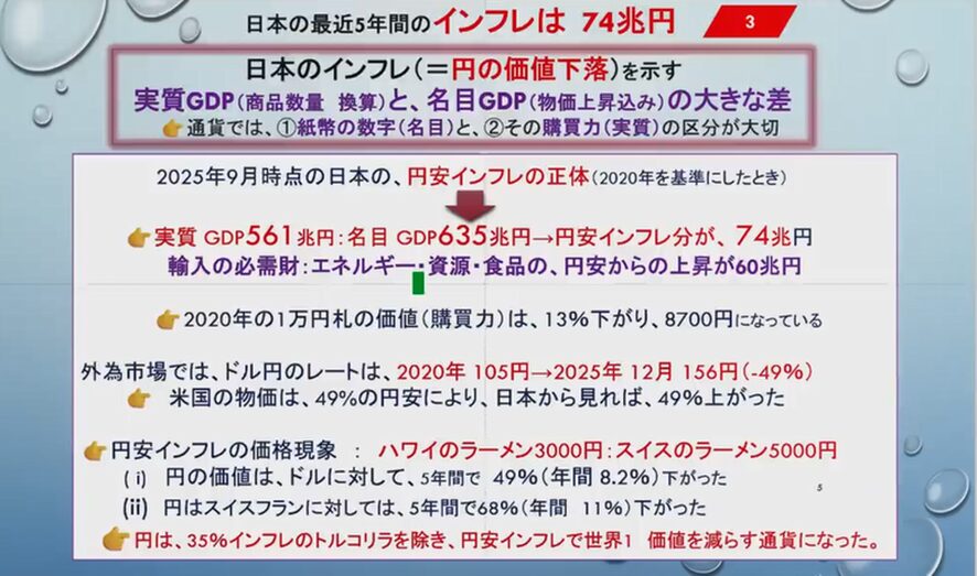 2025年9月時点の日本の円安インフレの正体を、2020年を基準にした時は、実質GDPで561兆円ですが名目GDPで635兆円なのです。つまり円安インフレ分が74兆円です。