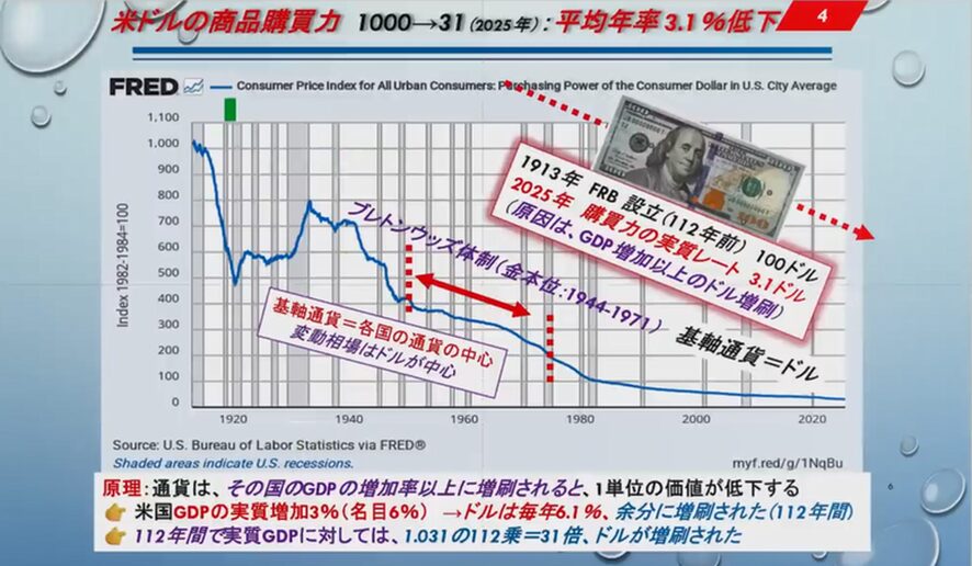 原因はGDPの増加以上のドル増刷です。これはFRB自身が購買力をこのように出しているFRBの表です。原理としては、通貨はその国のGDPの増加率以上に増刷されると1単位の価値が下落する。米国の100年のGDPの実質増加は3%であって、名目では6%、名目とはインフレ込みですね。ですからドルは毎年3.1%余分に増刷されて、112年間で実質GDPは1.031の112乗=31倍ドルが増刷されたからドルの価値は1000分の31になったということなのです。