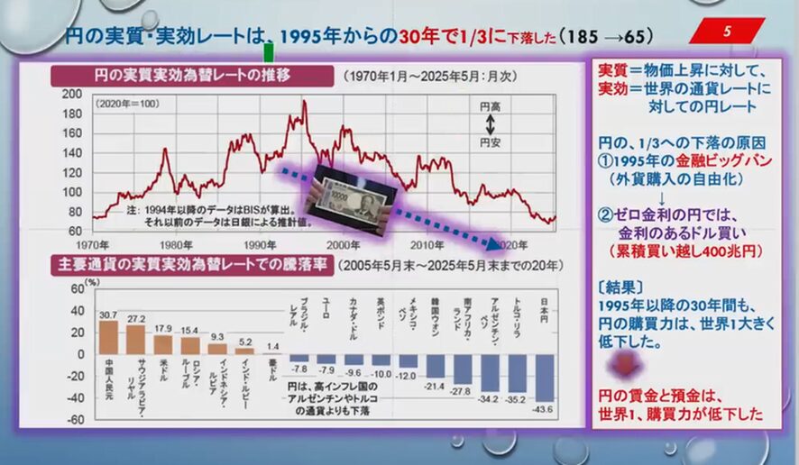 そうです。2005年の5月末から2025年の5月末の20年間の数字です。日本円が一番下がっています。トルコリラより下がっている。アルゼンチンペソより下がっているが、このデータを政府は出しませんよね。都合が悪いからですね。