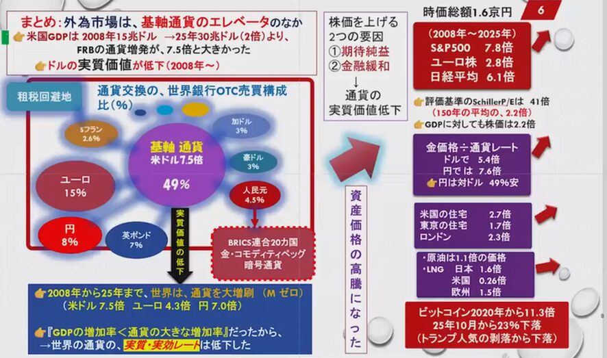 円が一番下がっているわけです。2008年から2025年世界は通貨を大増刷した。これはMゼロ(※5)という通貨で、7.5倍、ユーロは4.3倍、円は7.0倍だからこれが下落しています。GDPの増加率よりも通貨の大きな増刷だから、世界の通貨の実質・実効レートは下落しているのです。ただ日本はドル円だけで見ますからドルに対して下がったような感じしか分からないのですね。ところがドルそのものが下がっていますから、円はそれ以上に下落したわけです。その結果として、例えば世界の株価は時価総額が1.6京円になりました。S&P500が7.8倍、ユーロ株50が2.8倍、日経平均225が6.1倍です。