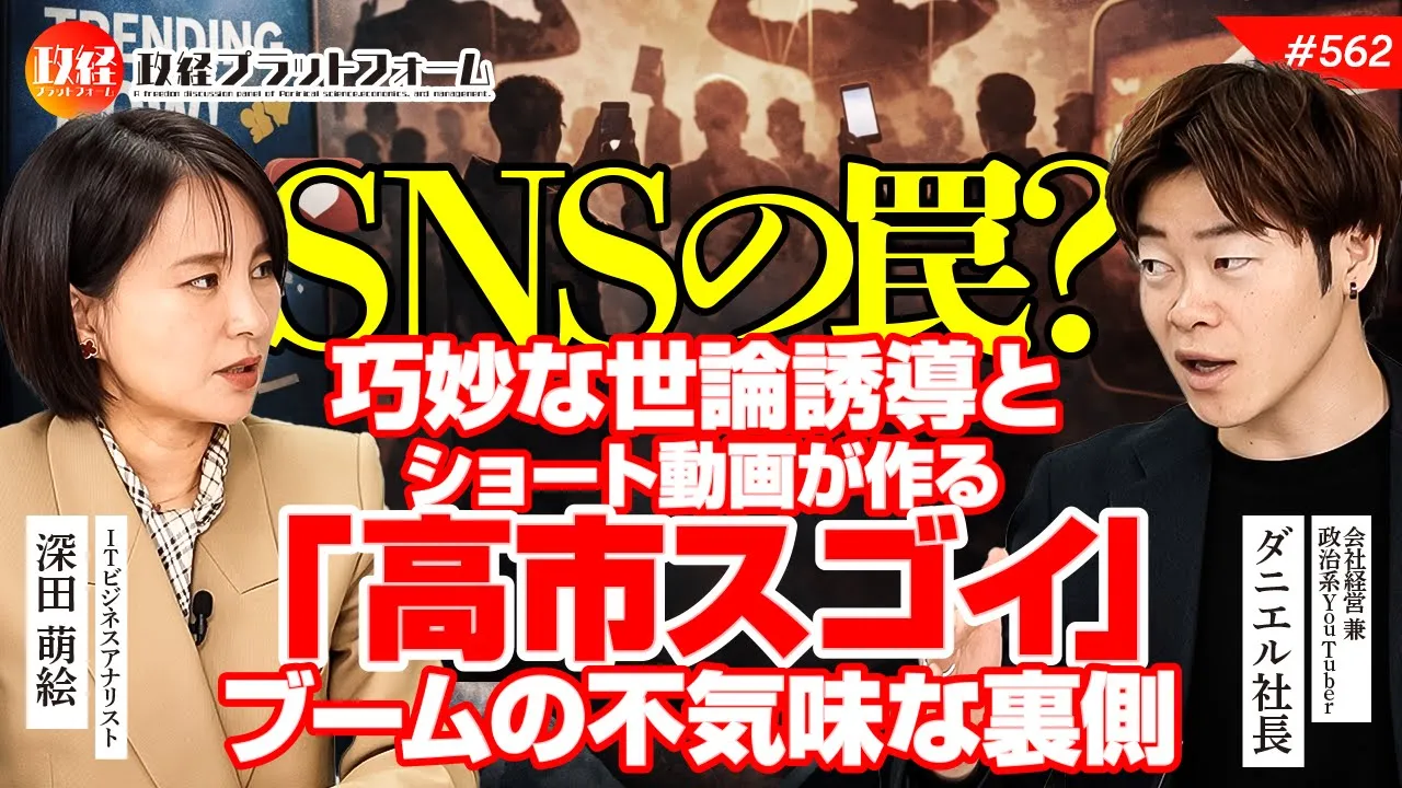 SNSの罠?巧妙な世論誘導とショート動画が作る「高市スゴイ」ブームの不気味な裏側 ダニエル社長 #562 公開済み 2026年1月7日 · 更新済み 2026年1月7日 【ご視聴はここをクリック】 【目次】00:00 1.オープニング00:39 2.ダニエル社長が政治に興味を持ったきっかけ01:42 3.ダニエル社長の高市総理評価04:50 4.高市政権は勝共連合的な流れを実行している様に感じる06:49 5.今の日本には戦前の軍国主義的な雰囲気を感じる11:25 6.特定の思考に誘導するパターンのSNSが増えてきた14:39 7.反対意見が圧し潰される状況になっていないか? Visited 17 times, 1 visit(s) today