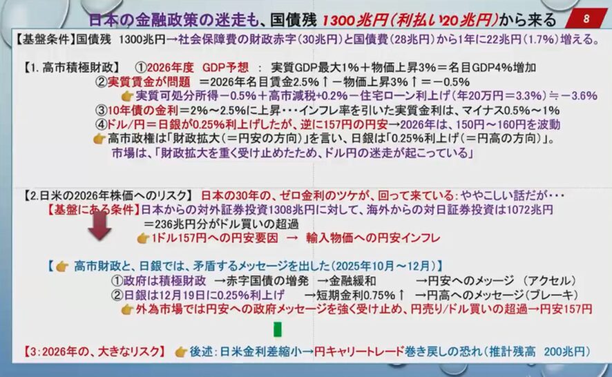 日本政府の財政に対する信頼がないということです。だから高市財政は積極財政で、さらに国債を増発するだろうと、円の価値は下がったわけです。さらに、これは問題を含んでいます。2026年の大きなリスクは、少なくとも日米金利差が縮小しています。