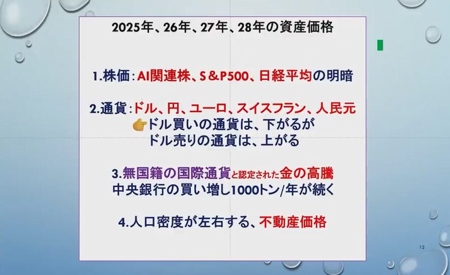 さて、ここからですが、2025年、26年、27年、28年の資産価格です。株価ではAI関連株とS&P500と日経平均の明暗があるのです。通貨では、ドル、円、ユーロ、スイスフラン、人民元でまとめて言えば、ドル買いをする通貨は下がるが、ドル売りの通貨は上がるということです。日本円がドル買いをすれば下がるし、ドル売りをすれば上がるということです。