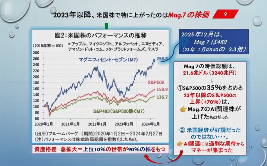 そうです。これの時価総額は3200兆円になっています。今、S&Pの時価総額が1京円ぐらいなので35%です。2023年以降のS&P500の上昇は70%です。Mag.7のAI関連株が上げた。米国経済が好調だったのではなく、AI関連に過剰な期待からマネーが集まっただけということです。