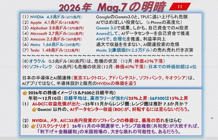 とんでもないことになる可能性があり、こういうことが明らかになったわけです。結局2026年のMag.7の株は上がったのですが、このNVIDIAの4.6兆ドル、それからMETAの1.66兆ドル、オラクル、ソフトバンクの株が危ない。オラクルは42%下落して、ソフトバンクは40%下落しています。