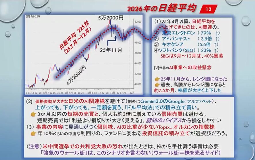 『2026年の日経平均』がどうなるのかというと、11月に4万2000円から5万2000円まで上がったのですが、その後レンジ圏に入っています。レンジ圏に入ったのは、東京エレクトロン、アドバンテスト、キオクシア、ソフトバンクが上がったのが下落したのです。ソフトバンクは40%今下がっています。世界のAI事業への収益懸念で、こうなっていて、7月以降日経平均も危なくなってきます。