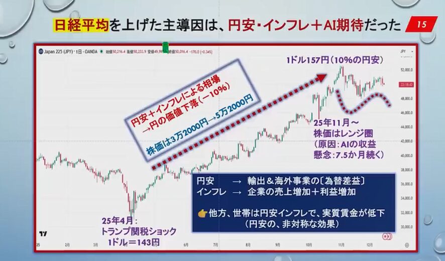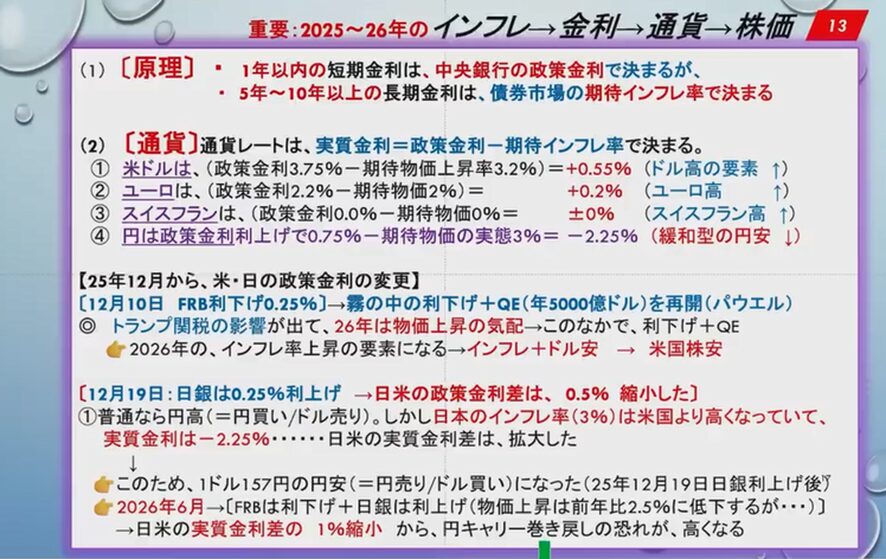 12月19日に日銀は利上げしました。日米の政策金利は0.5%縮小したのですが、普通なら円高になる。しかし、日本のインフレ率は米国より現在高くなっていまから、実質金利はマイナス2.25%で、日米の金利差は拡大したために、高市トレードと合わせて、円安にもなったのです。
