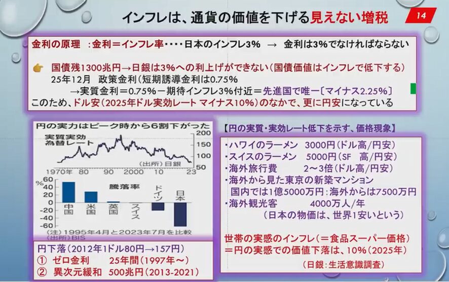 『インフレは通価の価値を下げる見えない増税』です。金利の原理で、金利=インフレ率というのが金利の原理なのです。日本のインフレで、金利は3%でなければならないのですが、国債があるために3%にできないわけです。できないから、日本の実質金利はマイナスになって、ドル安の中でどんどん下がっていく。実質金利0.75%、期待インフレ3%で、先進国で唯一マイナス2.25%ですから円はこのままでは下がっていくわけです。