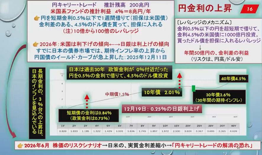 円キャリートレード巻き戻しの恐れがあって、推計残高が200兆円あるのです。これが巻き戻されると、日米の株価暴落という恐れがあります。これは2024年の8月初旬に1日で起こったブラックマンデーという現象です。1日で日経平均が20%下がって、S&Pが12%下がりました。1日の下げ幅で最大だった。それと同じことが2026年に起こる可能性があるのです。