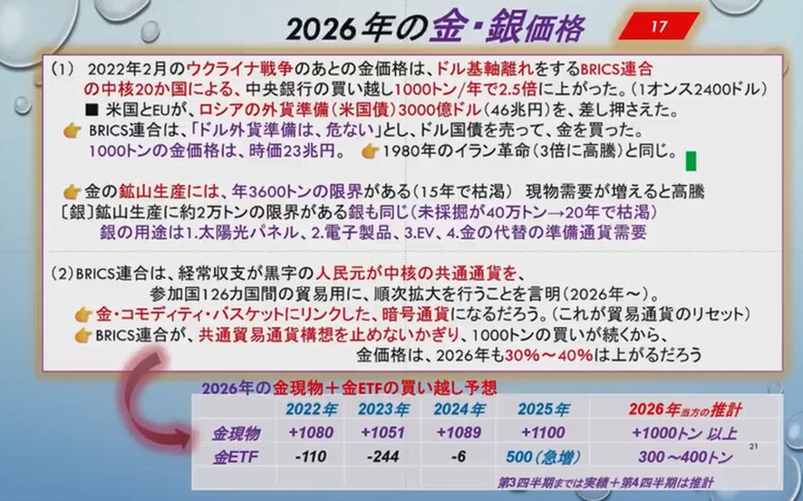 金の買い越しでは、2022年から2025年までは1000トン以上ですね。2021年までは500トンだったのです。ウクライナ戦争以降、2倍になって、ずっと続いています。2026年は、私の推計では1000トン以上です。さらに、金ETF(上場投資信託)も、2025年に金がなくなったので500トン買われています。2026年は300~400トン買われる可能性が高いです。つまり、金は上がります。
