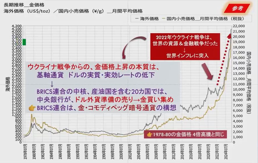 BRICS通貨の台頭で、ドルを外貨準備高としておいていても没収されたら意味がない。だから金を買うという20カ国の動き、それが金の高騰に繋がっていたところも良くわかって、やはり長期的にこれからも金が強いのだろうと明確にわかりました。