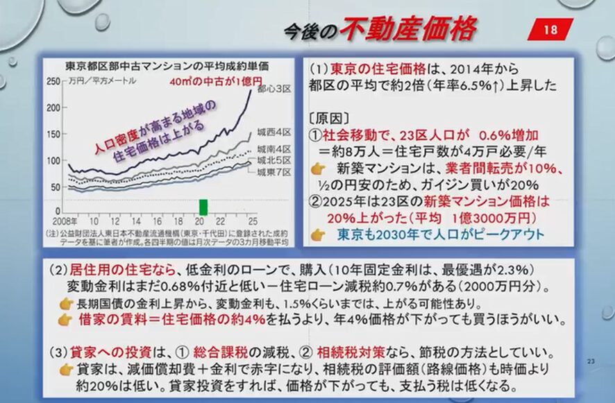 新築マンションの平均が1億3000万円になっています。ただし2030年で東京の人口がピークアウトします。当面は上がるでしょうが、今はそういう予想です。