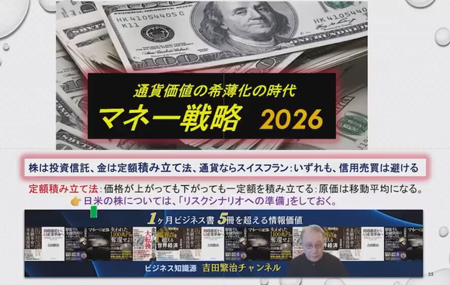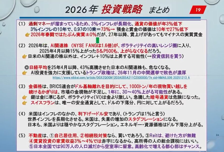 つまり通貨を増刷すると言っています。先ほど言ったように国債が大量に発行されますから、売れ残るのは困りますので、それを買って通貨を増刷する。インフレになるということです。トランプ関税の影響が出て、26年は物価上昇の気配です。この中で利下げとQEをやりますから、物価はさらに上がるでしょう。2026年のインフレの要素になる。インフレ、ドル安、米国株安というのが来年の流れです。