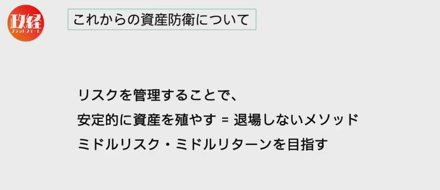 資産防衛をどうするのかということですが、今は高値圏にあり、2026年のリスクを踏まえつつ、安定的に資産を増やすことが重要になります。大きなリスクを取って高いリターンを狙うのではなく、一定のリスクは取りながらも「そこそこ」のリターンを目指すことが大切です。