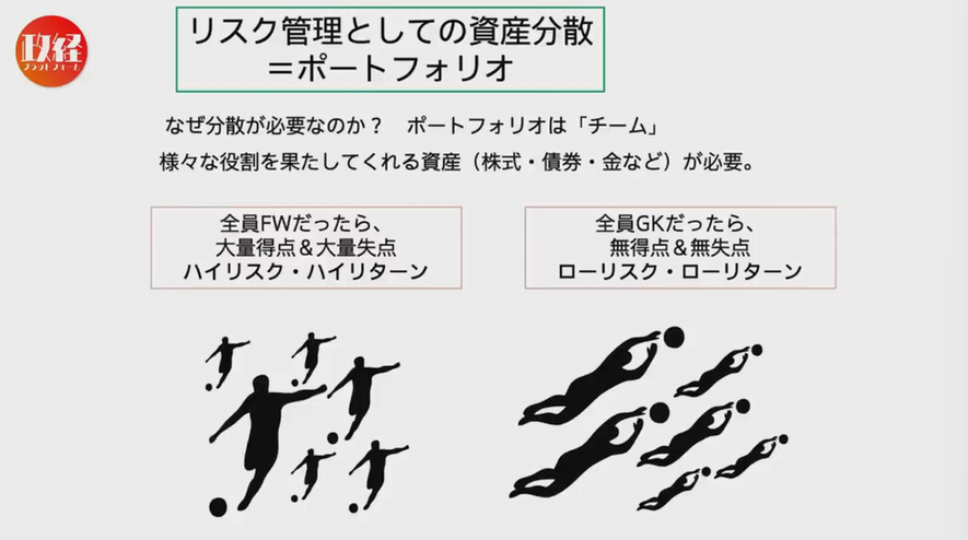 例えば、株式だけであれば、サッカーでは全員がフォワードでどんどん攻めるチームで、良い時はいいのですが、負ける時は大敗してしまいます。反対に、安全なローリスク・ローリターンは、全員がゴールキーパーで、ただ守るだけで、無得点無失点のような感じです。