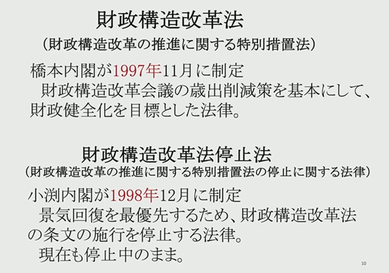 私も存じあげなかったのですが、1997年に「財政構造改革法」という非常に煌びやかな名前の法律が出来上がっておりまして「予算を減らしましょう」という緊縮財政のための法律なのですね。ところがその1年後にその法律を停止するという停止法ができているのですよ。何なんでしょうね。