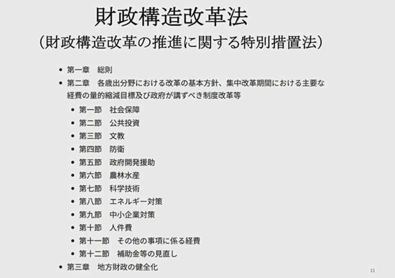 財政構造改革会議という会議があって、そこが「こういうものを作りましょう」と提案しているわけです。歳出削減策を基本にして、財政健全化を目標とした法律です。歳出を毎年減らすのだということなのですよ。