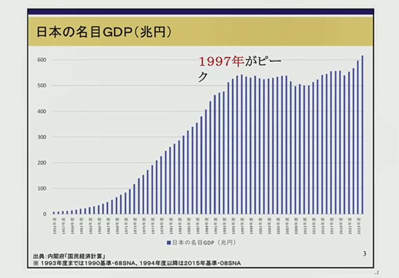 1997年は日本国の歴史的なイベントというか転換点だったのですね。GDPの名目ベースですが、97年がピークなのですね。そこから減ったわけではないけれども、ずっと横這いになっていて、直近では増えていますがインフレになって名目数値ですからね。