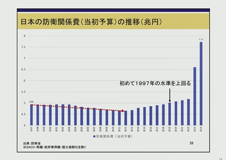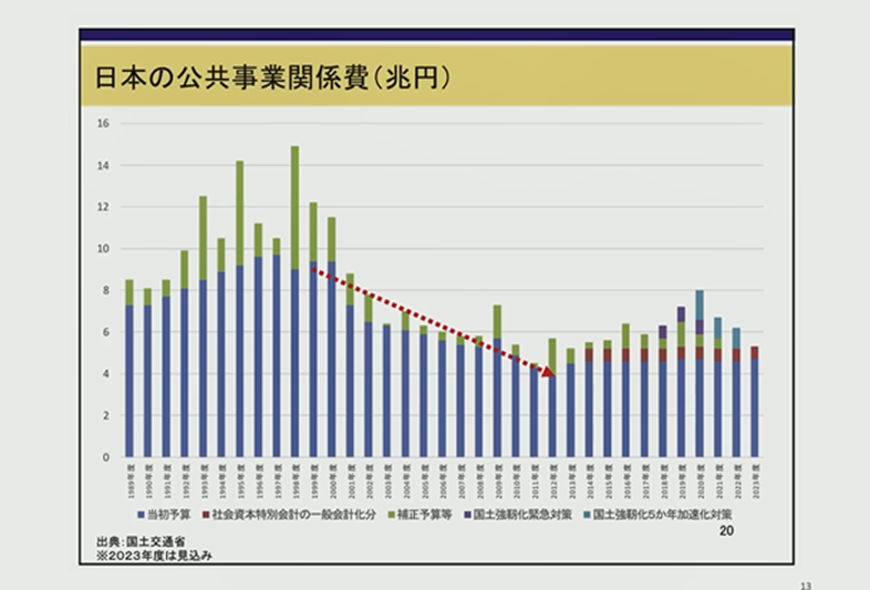 公共工事だけではなく、地方交付税だとか、防衛費も当初はずっとGDPの1%枠で、ずっと減っていくわけですね。ここ2年間ほど突出して大きくなっています。