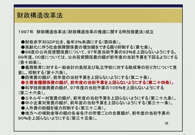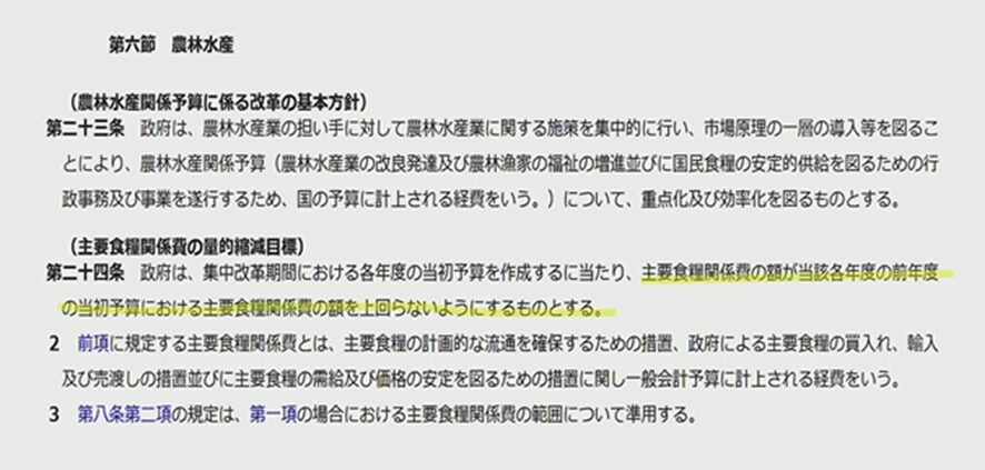 これは何が決まっているかというと、赤い文字は、農水省のところですね。「主要食料関係費の額が前年度の当初予算を上回らないようにする」と前年度の当初予算を上回らないということを毎年繰り返すと無くなってしまう。無くなるように法律は作られているのですね。