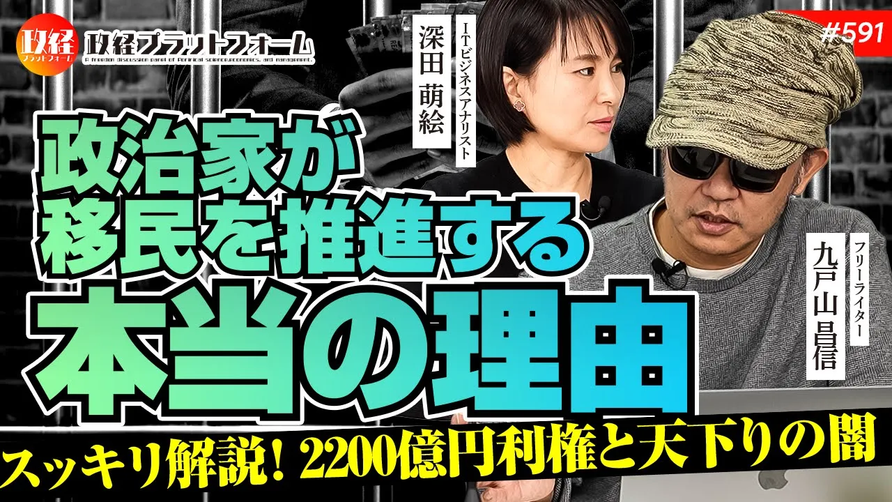 【これはやめられないわ!】政治家が移民を推進する本当の理由。2200億円利権と天下り団体の闇をスッキリ解説! 九戸山昌信氏 #591 公開済み 2026年2月5日 · 更新済み 2026年2月5日 【ご視聴はここをクリック】 【目次】00:00 1.オープニング00:37 2.移民ビジネス利権団体の闇08:07 3.大量の外国人流入で仕事が奪われ賃金が低迷する12:15 4.大量の外国人が政治利用されている14:57 5.小選挙区制、賃金低下、独禁法の改悪は繋がっている