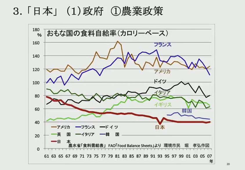 そこが、なかなか難しいのですが、少し我が国の状況をおさらいすると、食料自給率はもう何十年間もずっと下がってきました。
