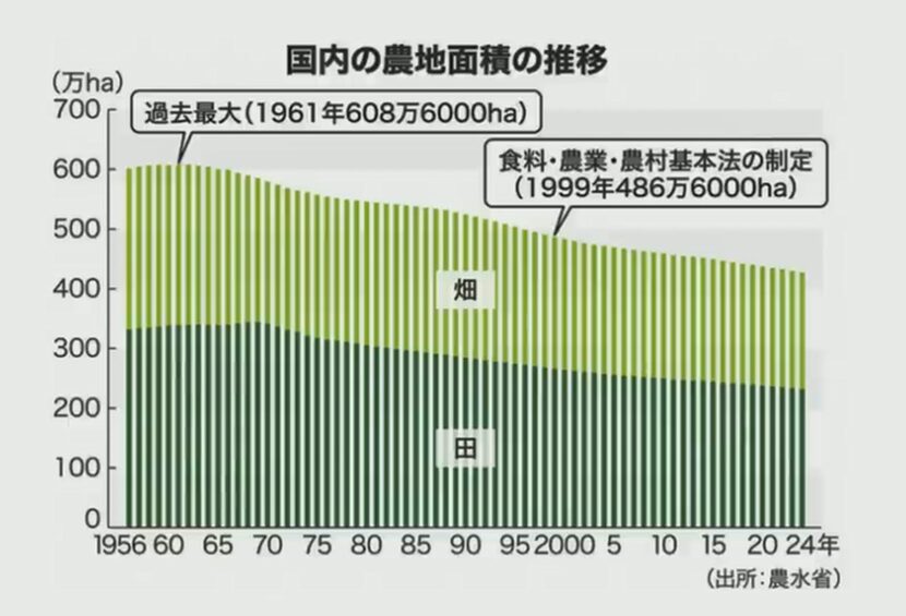 だから「食料自給率を上げますよ」と我が国の政府はもうずっと声高に一生懸命言ってくださり、食料自給率を上げようとしたにも関わらず田んぼも畑もずっと減り続けました。