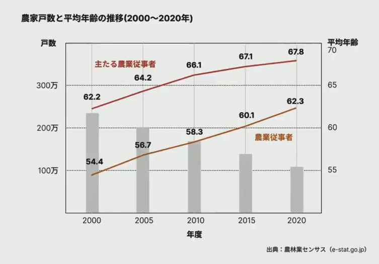 農家の人も棒グラフのように、ずっと減り続けました。農家が減り続けるだけではなく、高齢化していきました。つまり新規参入者が入っていないわけです。後継者が入っていない。これは産業としては、農業はもう崖っぷちまできました。