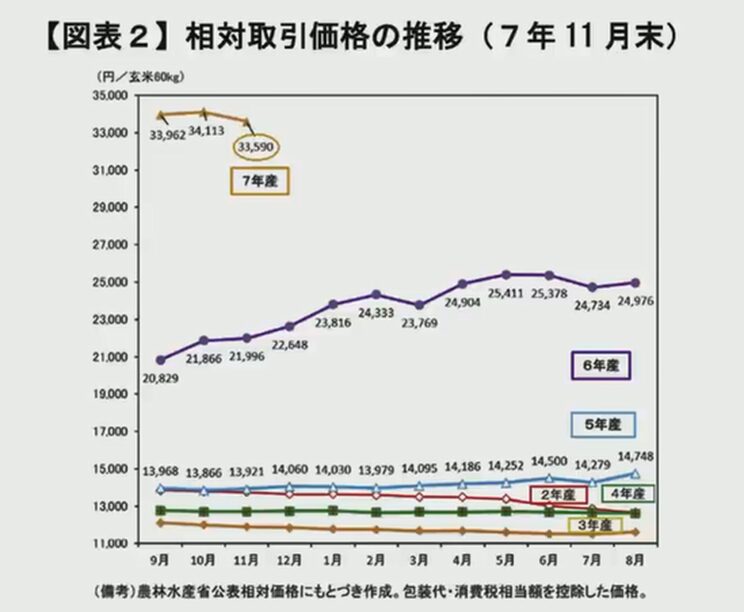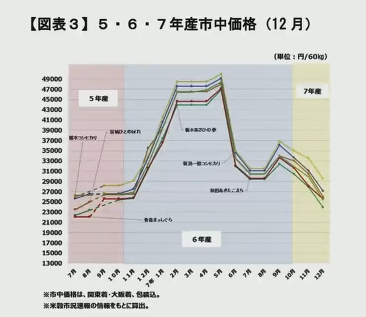 このグラフは、値段はずっと上がってきたのだけれども、これから右の方に行けば、新しい7年産の米になるのですが、ずっと上がってきたのが、もう下がり始めているのです。農家の方は、昨年あれだけ暑い夏だったのに、非常に上手な農作業と田んぼの管理をしていただいて、生産量は平年作よりも少し多めに取れたのです。だから逆に在庫が増えてしまい、価格が大暴落するかもしれないと今恐れ慄いているのです。